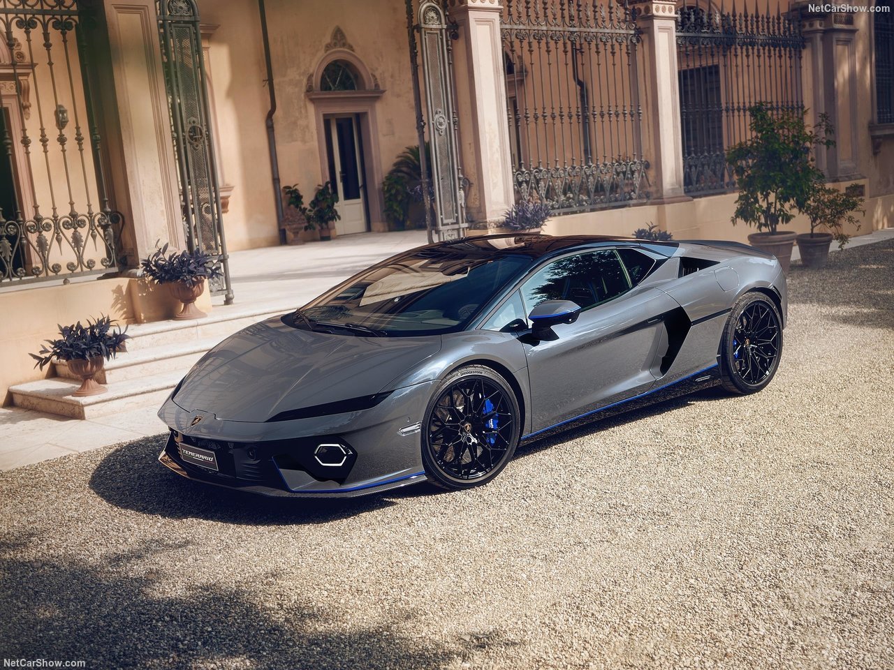 O exterior do Lamborghini Temerario tem acabamento em Grigio Serget, combinando uma tonalidade cinza distinta enriquecida com flocos azuis que emergem sob a luz do sol para um efeito visual cativante. As partes inferiores do carro são em preto brilhante Nero Noctis, finalizadas com uma fina faixa dinâmica em Blu Royal, que também é encontrada na asa traseira, acentuando o perfil dinâmico do novo Temerario. O splitter dianteiro, o difusor traseiro e as entradas de ar têm acabamento com efeito de carbono preto brilhante, enquanto o teto e o logotipo da Lamborghini têm acabamento em preto brilhante para contrastar na traseira com as saídas de escape em preto fosco. As rodas Velador em preto brilhante contrastam com as pinças de freio azuis, lembrando aos espectadores que o novo Temerario é tanto uma referência em desempenho de supercarro esportivo quanto um sofisticado veículo de estilo de vida.